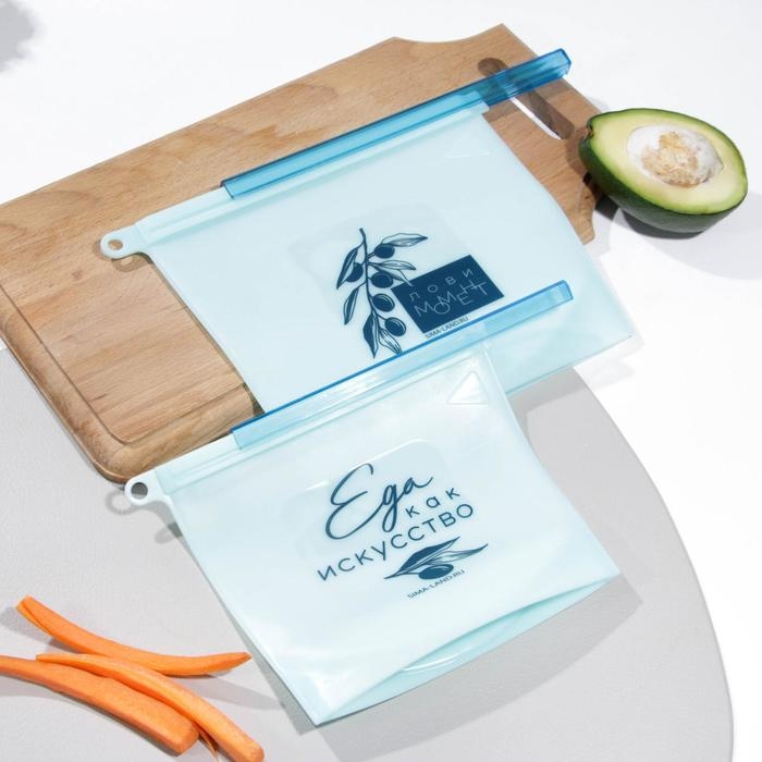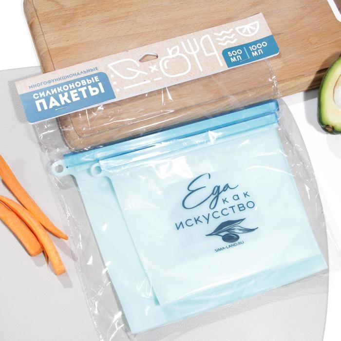 Набор включает в себя два прямоугольных пакета разного объема: 500 мл и 1000 мл. Это позволяет выбрать подходящий размер для различного количества продуктов. Герметичный zip-lock обеспечивает надежное хранение продуктов и предотвращает их испорченность.