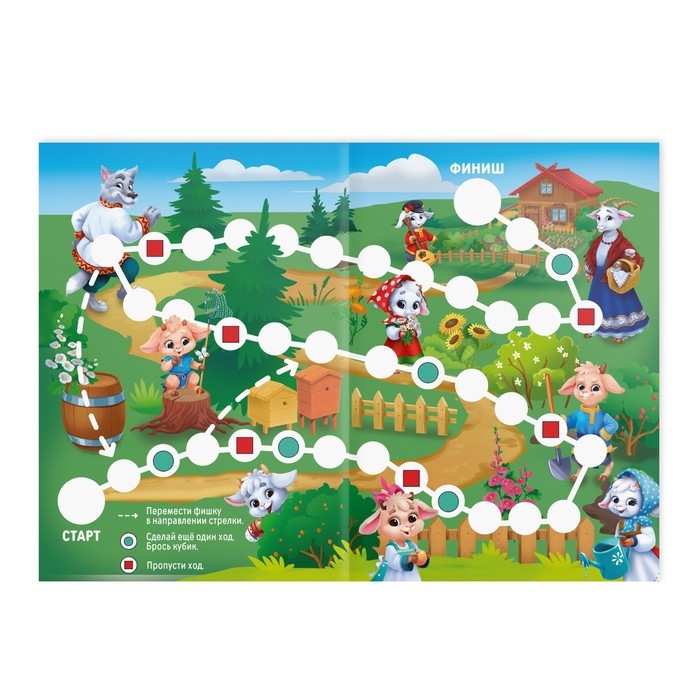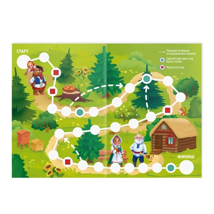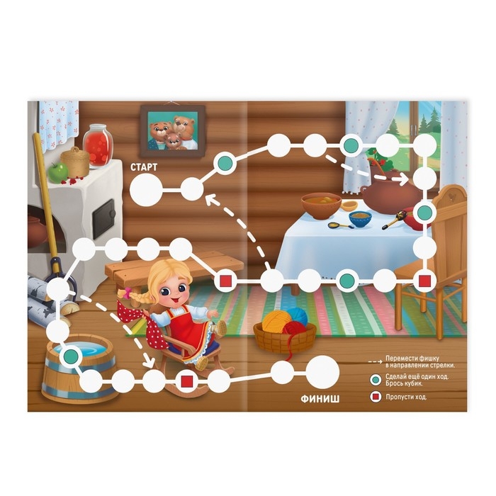 Для начала поставьте фишки на клетку «Старт». По очереди бросайте кубик и передвигайте фишку на выпавшее число клеток. Если фишка остановилась на клетке со специальным обозначением (они указаны на игровом поле), выполните действие обозначения и завершите ход. Победит тот, кто первым доберётся до клетки «Финиш».