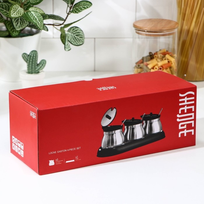 Стильный набор баночек для сыпучих продуктов украсит интерьер вашей кухни. Баночки изготовлены из стекла и металла, имеют удобные откидные крышки, ложки и подставку в комплекте. Ложки из нержавеющей стали, подставка пластиковая. Такие баночки можно испльзовать для хранения и подачи специй, сахара, конфет, мёда, варенья и других продуктов.
