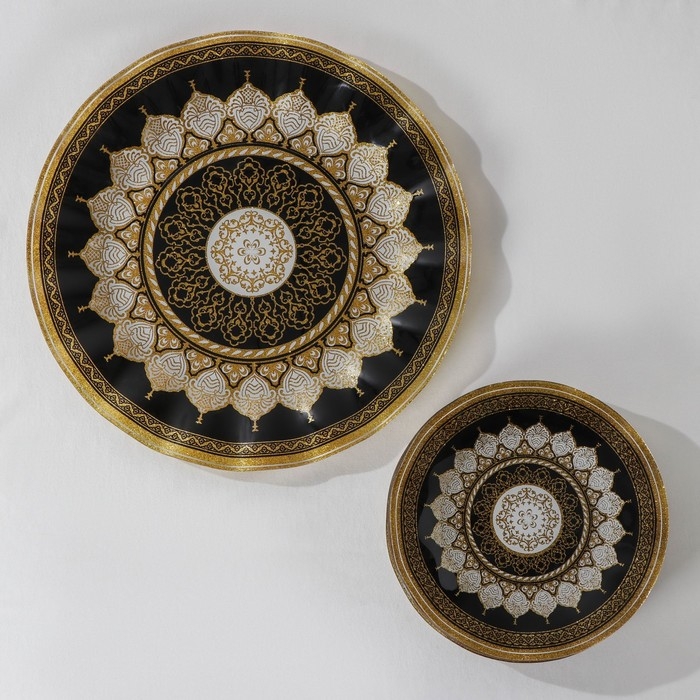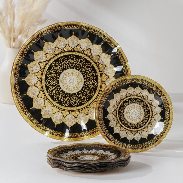 Набор столовый «Мехенди» состоит из 7 предметов в элегантном дизайне золотисто-черных оттенков с узором. Каждый предмет изготовлен из высококачественного стекла, которое придает посуде прочность и стойкость к царапинам.