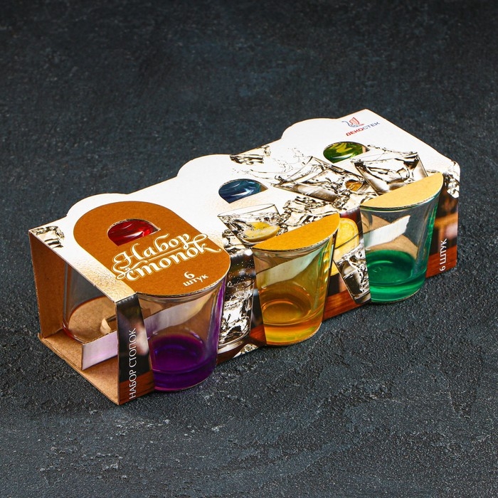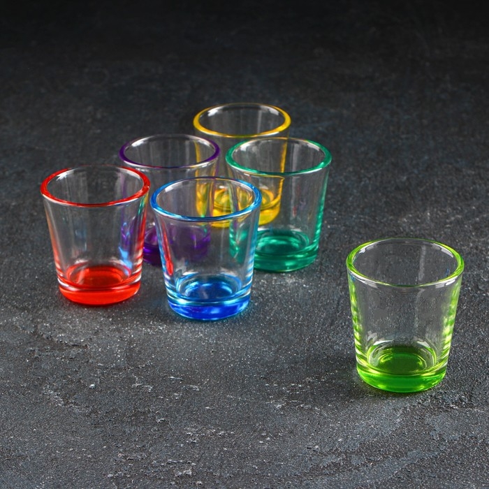 Набор стопок состоит из 6 шт, объём 50 мл. Разноцветные стопки сделаны из толстого качественного стекла. Такие яркие стопки поднимут вам и вашим гостям настроение.