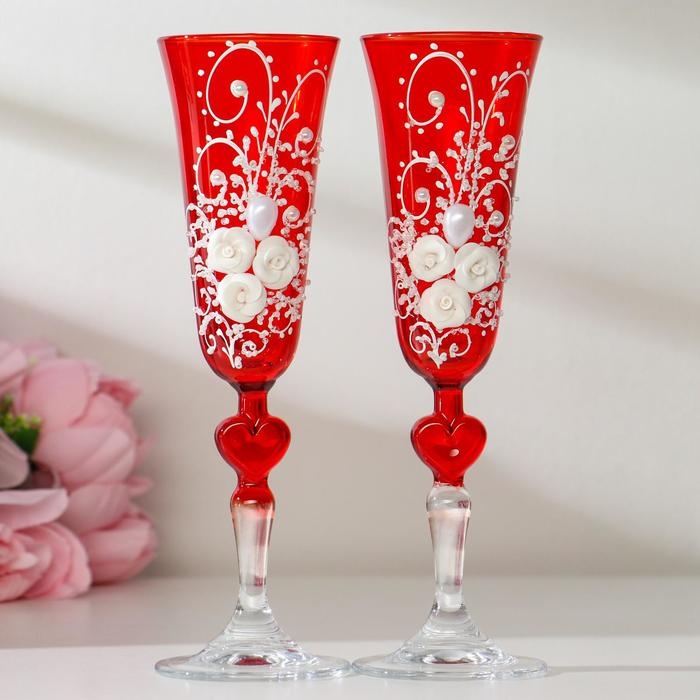 Набор свадебных бокалов "Розы", с лепниной и сердцем на ножке, красный