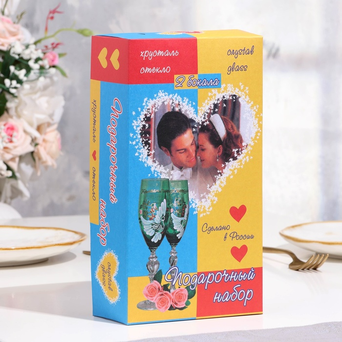 Существует давняя традиция — бить фужеры на счастье после регистрации брака. Считается, что звон разбивающегося стекла и его осколки создают защиту от злых духов для новой семьи. Если вы планируете придерживаться такой традиции, рекомендуем вам приобрести две пары фужеров, одни — для битья, вторые — на стол молодожёнов.