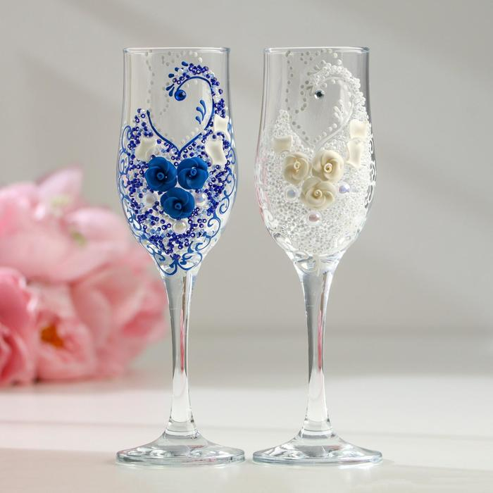 Набор свадебных бокалов "Шик", с розочками, сине - белый