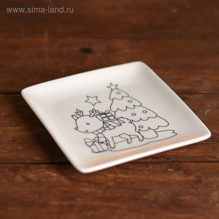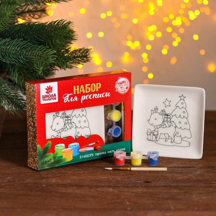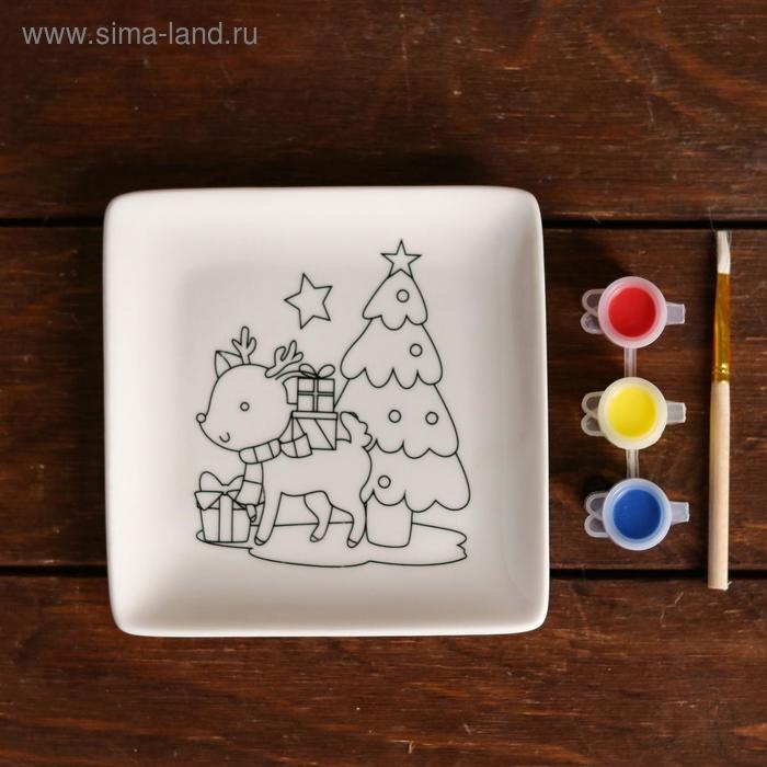 Набор тарелка под раскраску «Олень с подарками» краска 3 цв по 2 мл, кисть