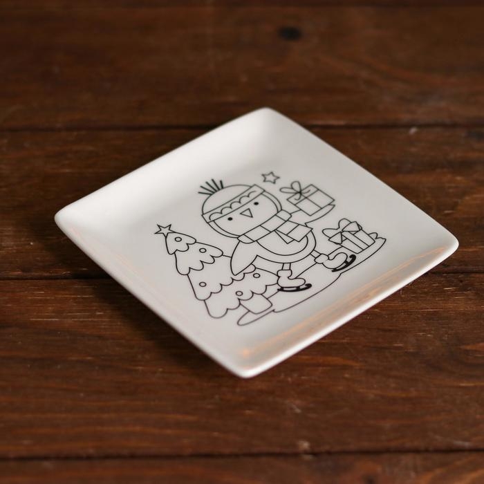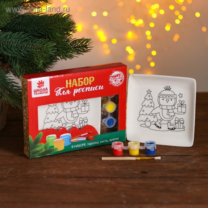 Набор тарелка под раскраску «Пингвин с подарками» краска 3 цв по 2 мл, кисть