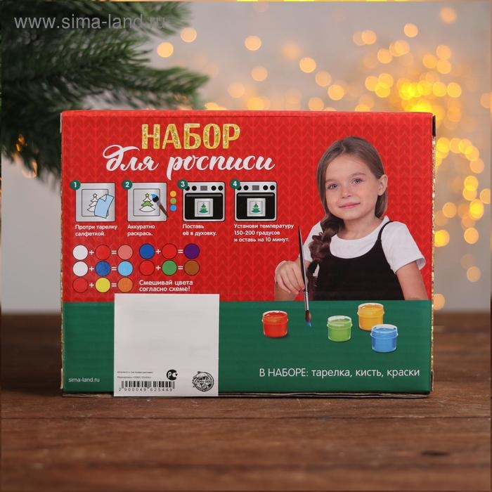 На тарелке нанесены контуры будущего изображения, которые крохе предстоит заполнить акриловыми красками. После высыхания они хорошо держатся на керамической поверхности, так что изделие можно будет мочить и даже разогревать в микроволновой печи.
