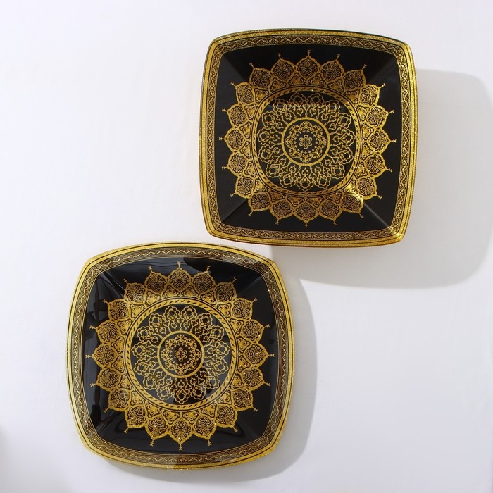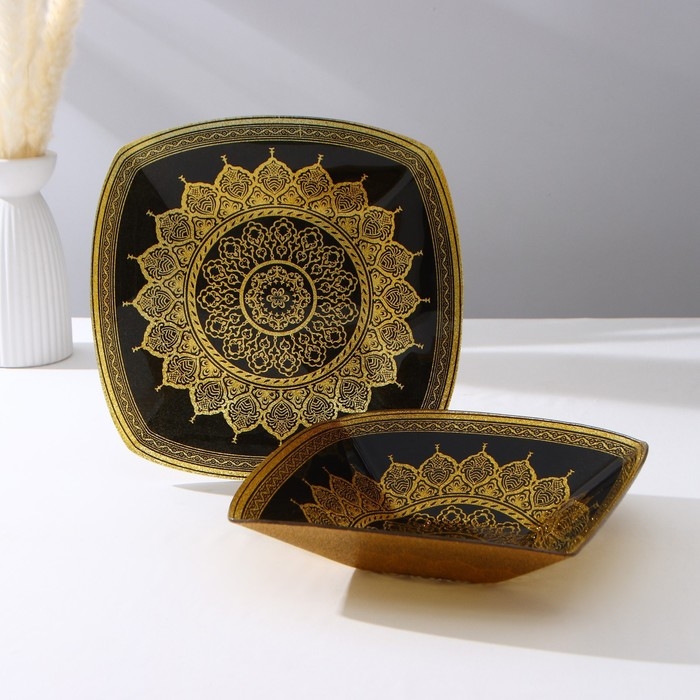 Набор тарелок «Мехенди», 2 предмета: d=28,5 см, d=30.5 см, цвет золотой с чёрным, стекло