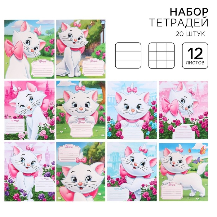 Набор тетрадей 20 штук, 12 листов, 10 в клетку и 10 в линейку, обложка мелованный картон, Коты аристократы