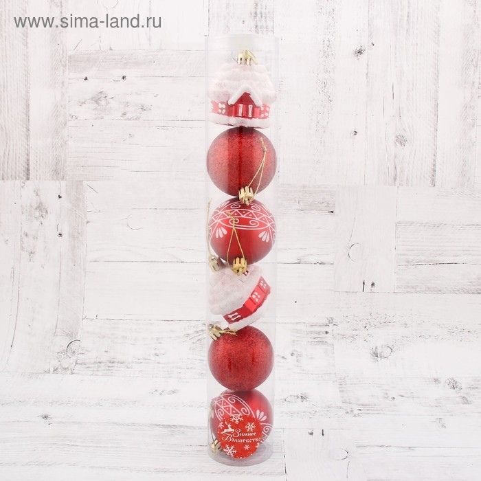 Набор украшений пластик 6 шт "Праздник" (4 шара, 2 домика) 6 см, красный