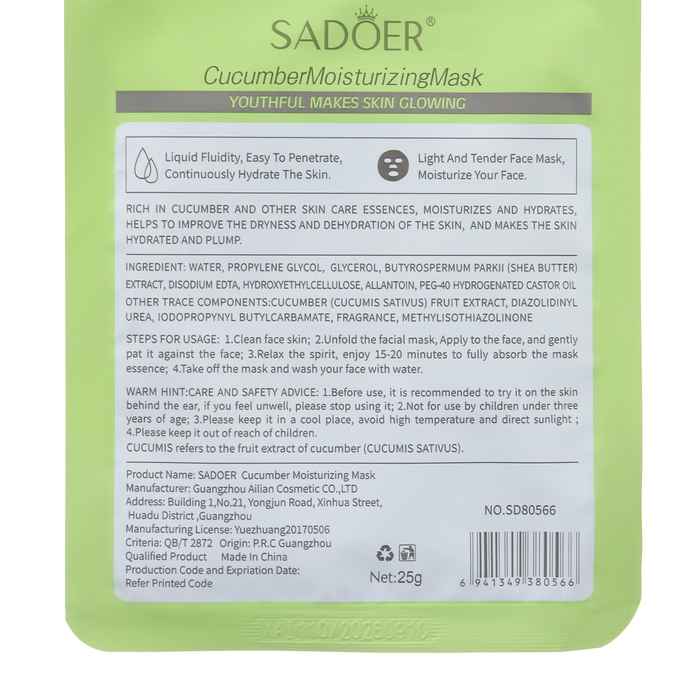 - Тканевая маска для лица с экстрактом огурца, увлажняющая - 2 шт