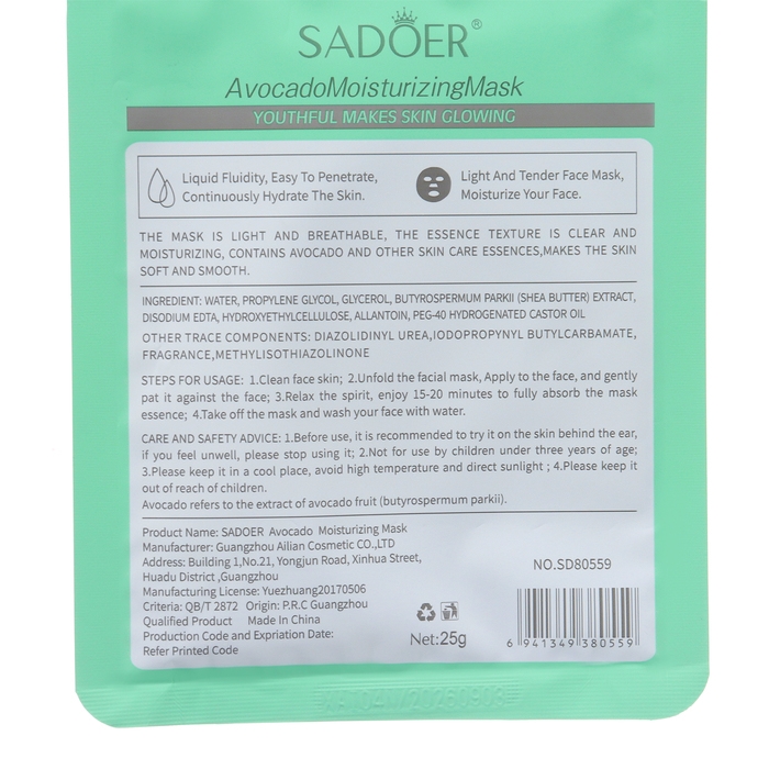 - Тканевая маска для лица с экстрактом авокадо, увлажняющая - 2 шт