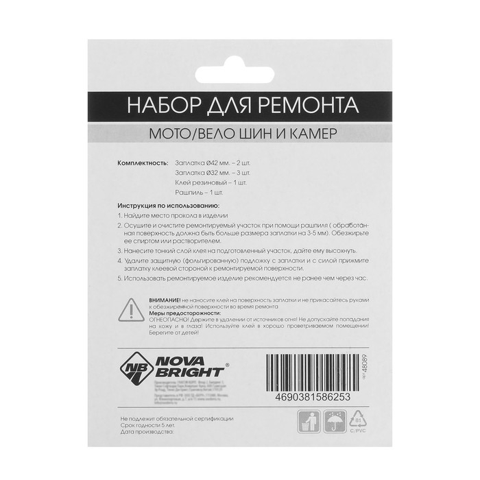 Набор заплаток для ремонта камер Nova Bright, 2 шт - 42 мм, 3 шт - 32 мм, клей, рашпиль
