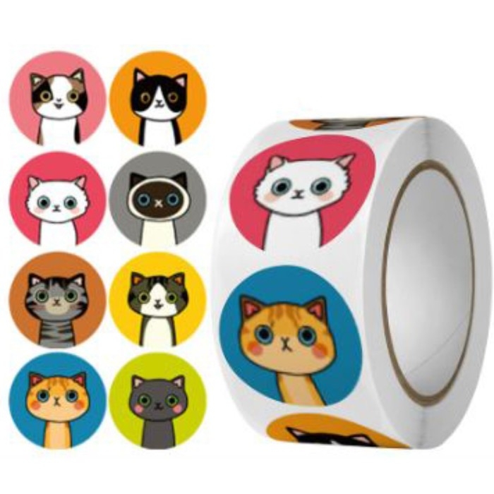 Наклейка бумага "Нарисованные кошки" d=2,5 см 500 шт в рулоне 3х6,5х6,5 см