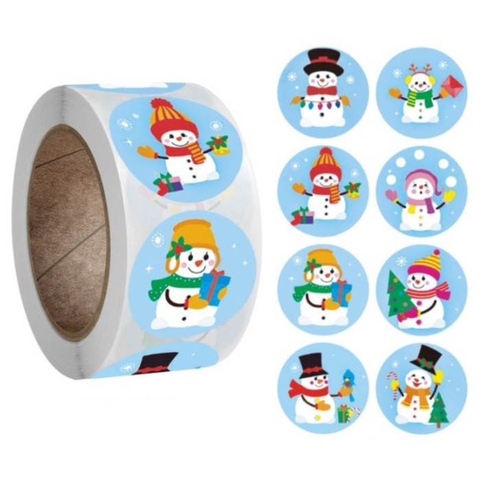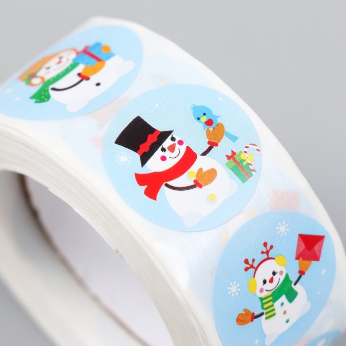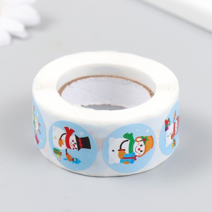 Наклейка бумага "Праздничные снеговики" d=2,5 см 500 шт в рулоне 3х6,5х6,5 см