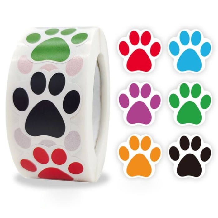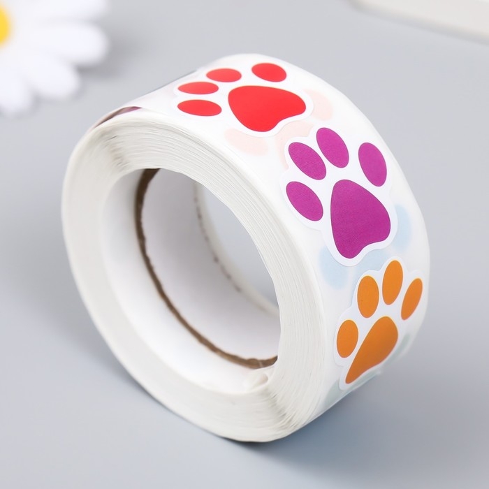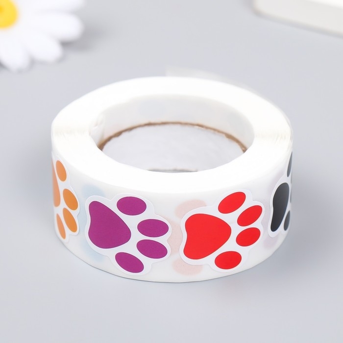 Наклейка бумага "Разноцветные лапки" d=2,5 см 500 шт в рулоне 3х6,5х6,5 см