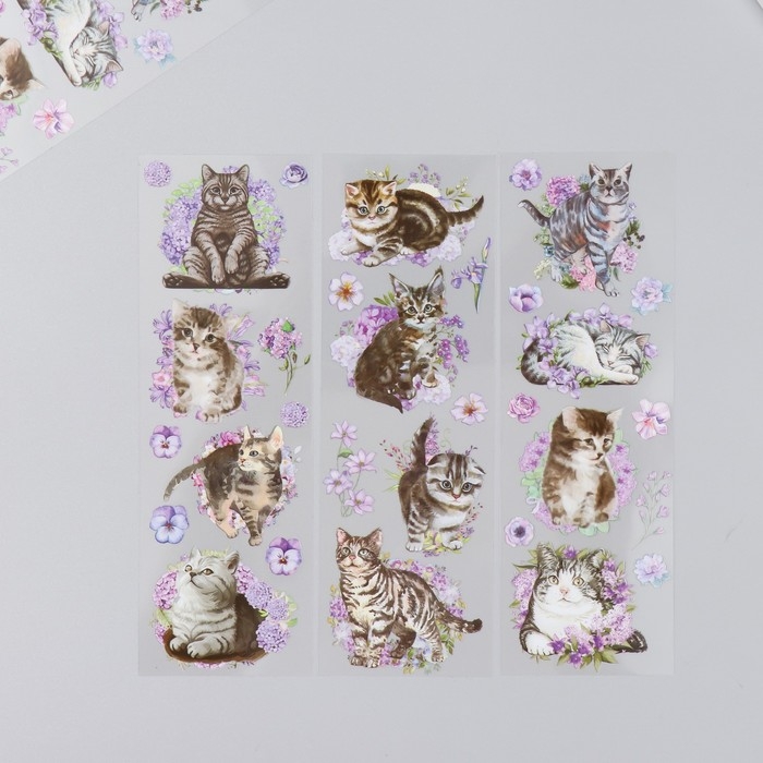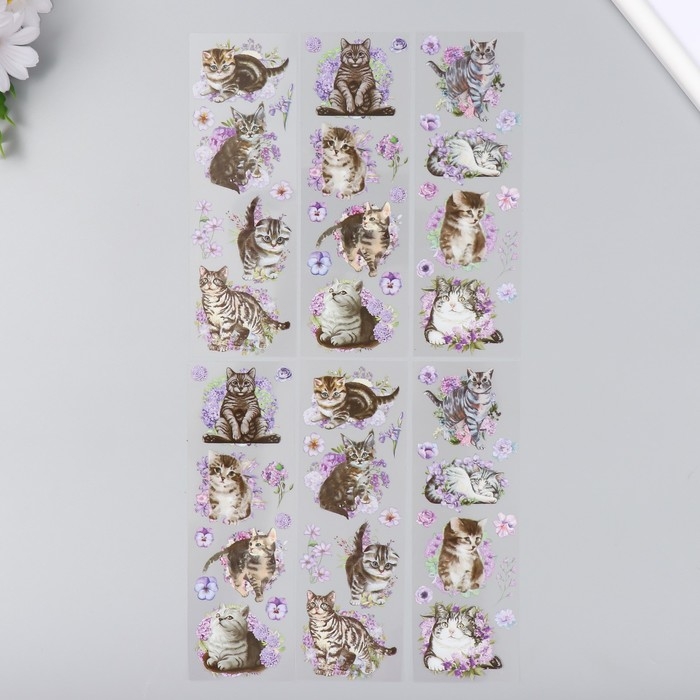 Наклейки для творчества "Полосатые котики и сиреневые цветы" набор 6 листов 18х6 см