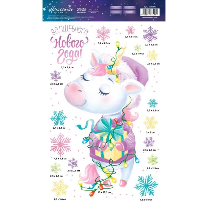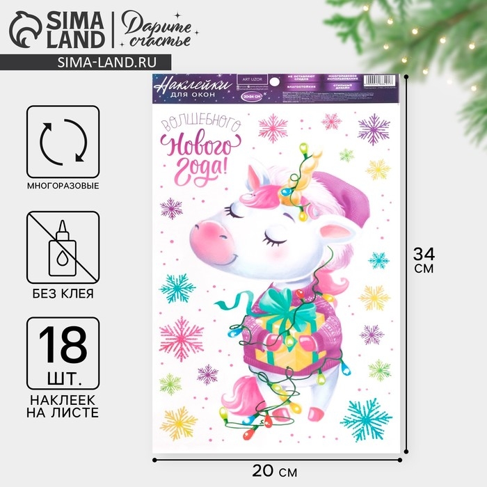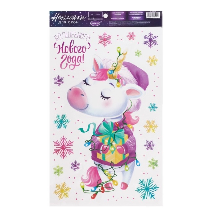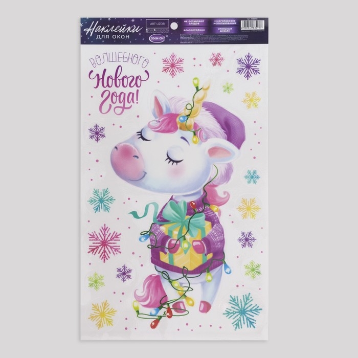 Наклейки новогодние на окна, виниловые «Единорожек», многоразовые, 20 х 34 см, Новый год