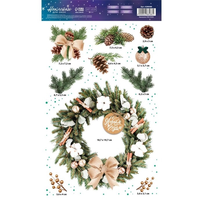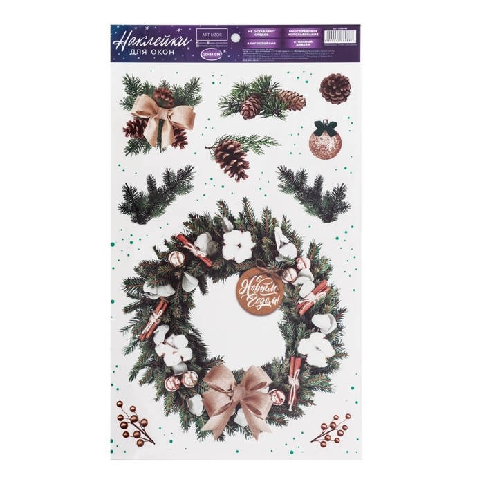 Наклейки новогодние на окна, виниловые «Новогодний венок», многоразовые, 20 х 34 см, Новый год