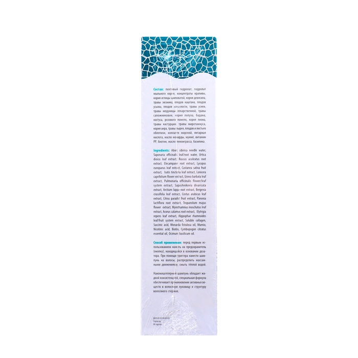 Состав: пихтовый гидролат, гидролат мыльного корня, концентраты крапивы, корня иглицы шиповатой, корня девясила, травы зюзника, плодов каштана, плодов усьмы, плодов жимолости, травы уснеи, травы медуницы лекарственной, травы сапожниковии, корня лопуха, бадана, костуса, розового помело, корня пиона, травы настурции, травы миротамнуса, корня аира, травы пырея, плодов и листьев облепихи, коллаген морской, янтарная кислота, масло монарды, мумиё, витамин РР, биотин, масло лемонграсса, базилика.