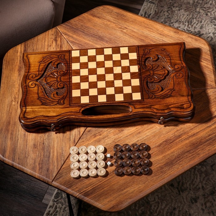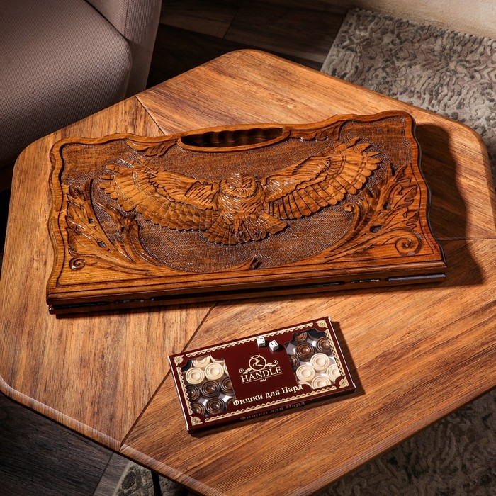 Нарды ручной работы "Филин", глубокая резка, с ручкой, 60х30 см, с шахматным полем, массив ореха, Армения