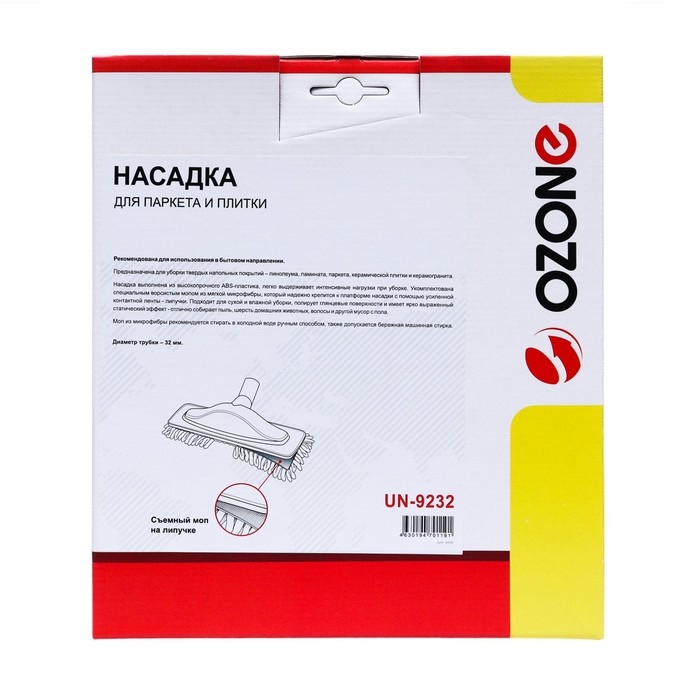 Эта насадка для пылесоса UN-9232 Ozone - ваш идеальный помощник в уборке паркета и плитки. Ее уникальная конструкция с использованием микрофибры позволяет не только тщательно очистить поверхность, но и придать ей великолепный блеск. Насадка легко крепится к трубке диаметром 32 мм и готова к использованию в любой момент. С ней уборка станет быстрее, проще и эффективнее, а результат будет радовать вас своей безупречностью.