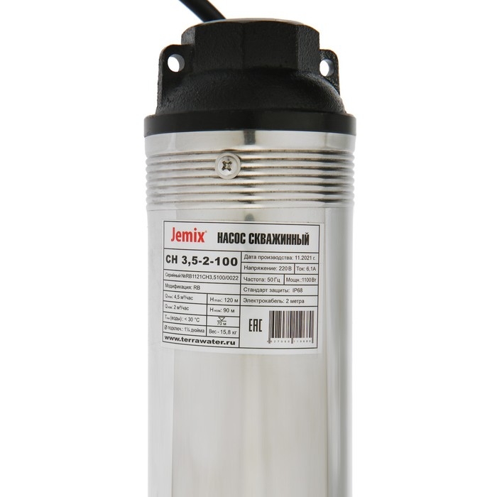 Насос скважинный JEMIX СН 3,5-2-100, центробежный, 1100 Вт, напор 120 м, 75 л/мин, кабель 2м