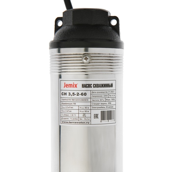 Насос скважинный JEMIX СН 3,5-2-60, центробежный, 750 Вт, напор 80 м, 75 л/мин, кабель 50 м