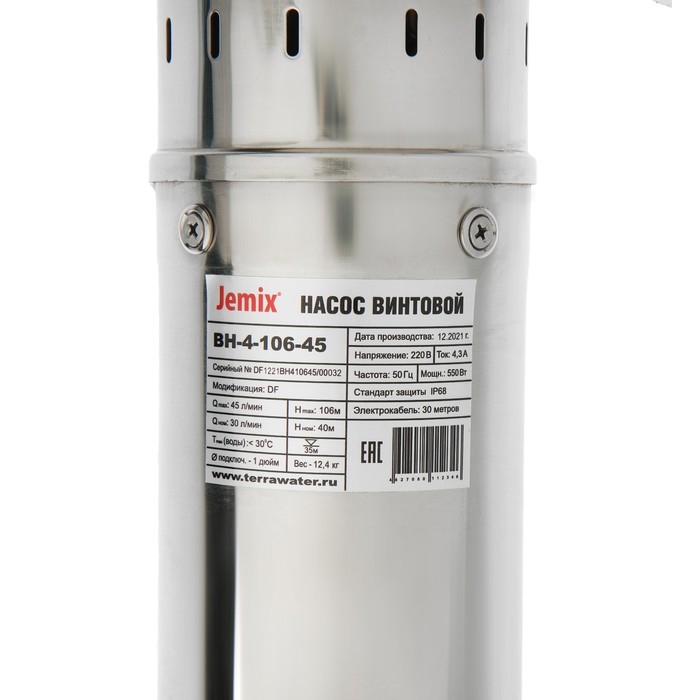 Насос скважинный JEMIX ВН-4-106-45, винтовой, 550 Вт, напор 106 м, 45 л/мин, кабель 30 м