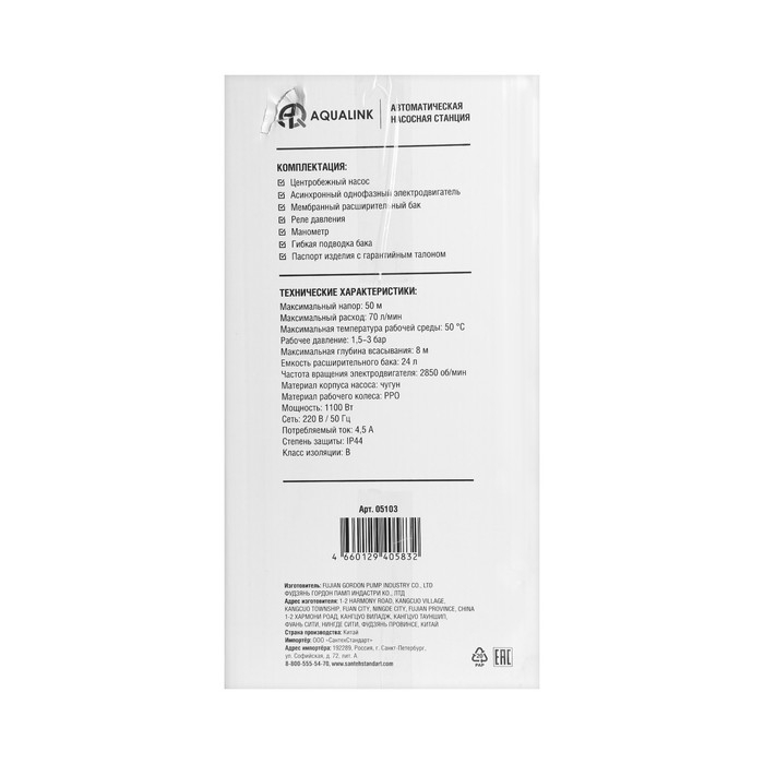 Насосная станция AQUALINK AS CI-50/70-24, 1100 Вт, 70 л/мин, напор 50 м, бак 24 л