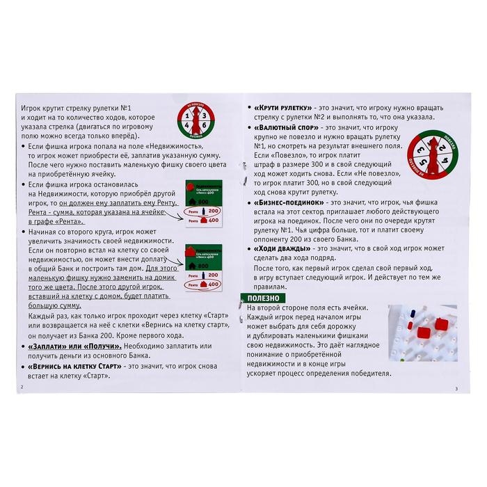 Участникам предстоит передвигаться по игровому полю, вставать на специальные обозначения и выполнять определённые действия. Помните: чтобы победить, вам нужно заработать больше, чем остальные участники. Поэтому выстраивайте стратегию, зарабатывайте большие суммы, приобретайте недвижимость и побеждайте!