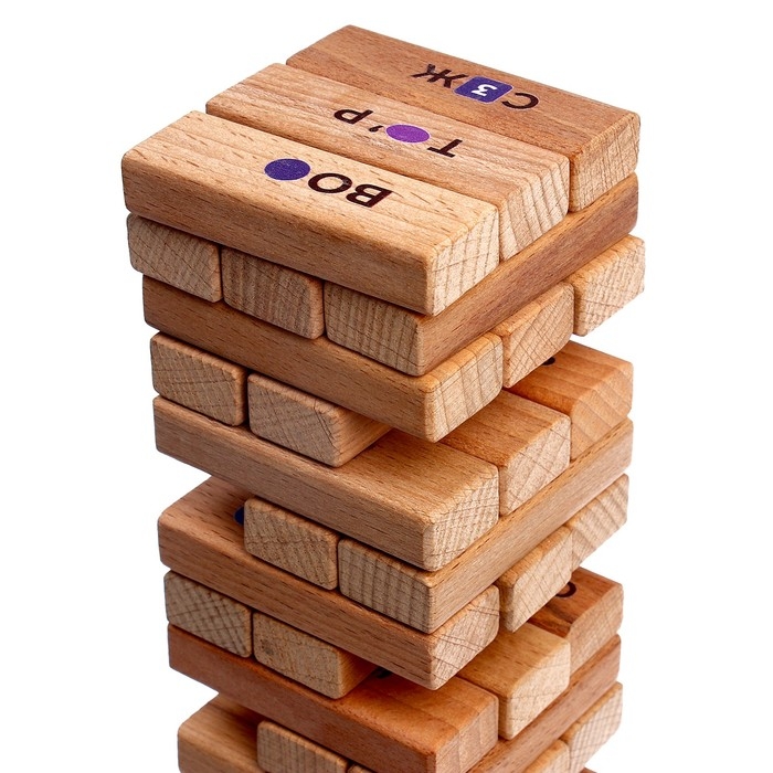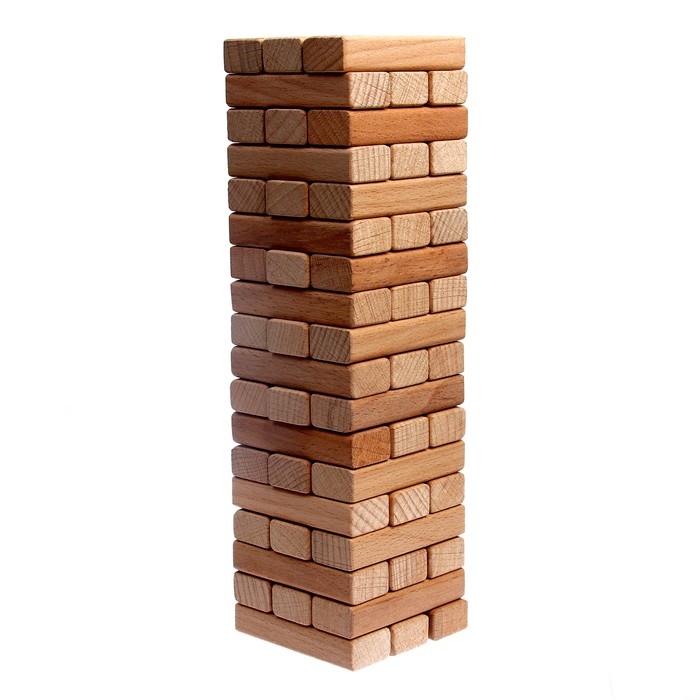 - Игроки по очереди ходят, вытаскивая по одному бруску из любого уровня башни (кроме верхнего) и кладя его наверх.