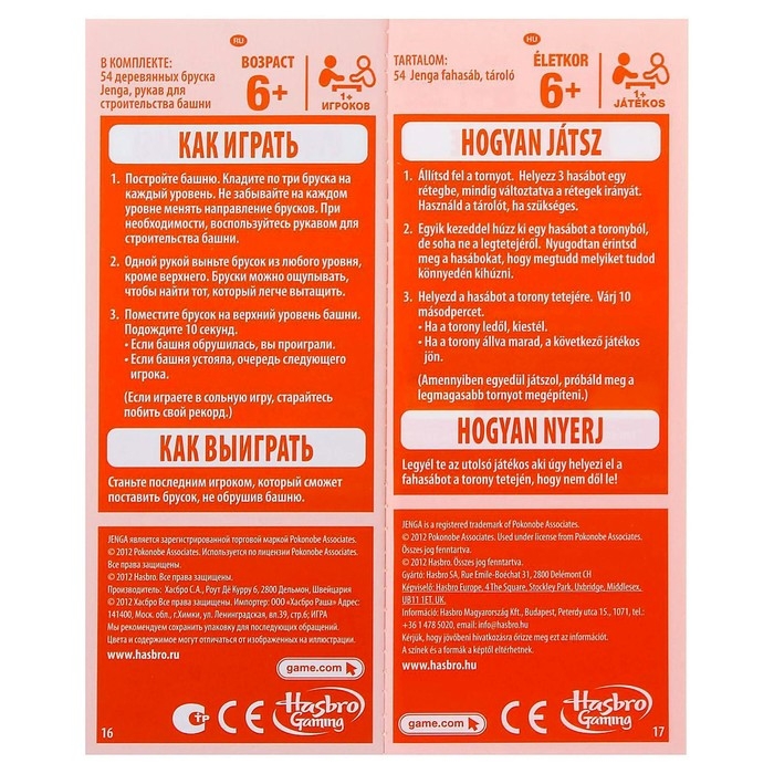 В коробке вы найдёте 54 деревянных бруска (размер каждого: 7,5 * 25 * 1,5); рукав для строительства башни и короткие, но полные правила.