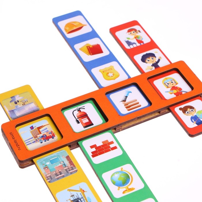 - После того как малыш освоится, можете делать ошибочные цепочки: например, пожарному в качестве атрибута поставить глобус, учителя поставить работать в магазине т. д.Задача малыша — поправить ваши ошибки.