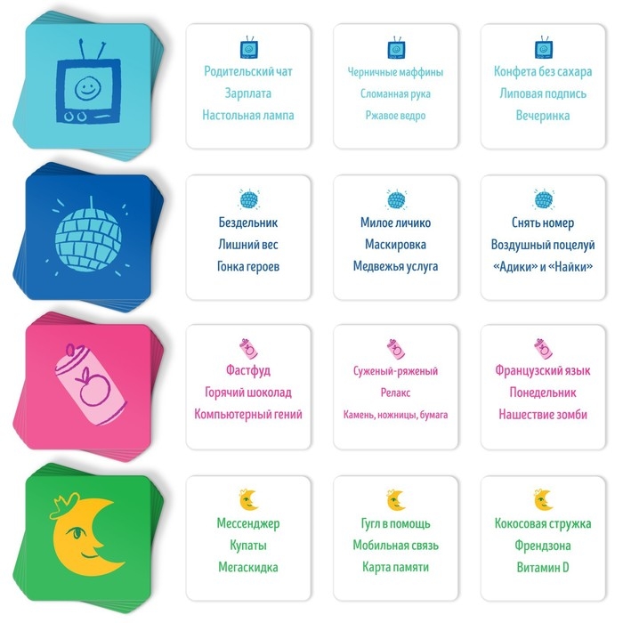 Чтобы было интереснее, игра проходит на время! У объясняющего игрока будет 1 минута, а у остальных игроков его команды — всего 30 секунд. Попробуйте словить коннект, чтобы достичь нужного результата (как можно больше победных очков). Команда получает столько победных очков, сколько карт игроки разложили правильно.