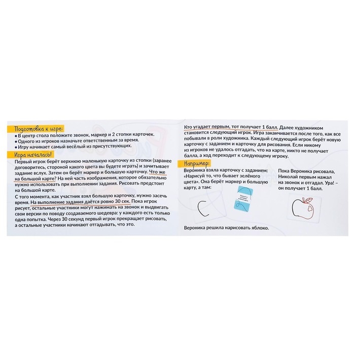 Задача участника — за 30 секунд нарисовать то, что указано в задании с карточки, используя изображенные детали будущей картинки. Задача соперников — отгадать шедевры юного художника.