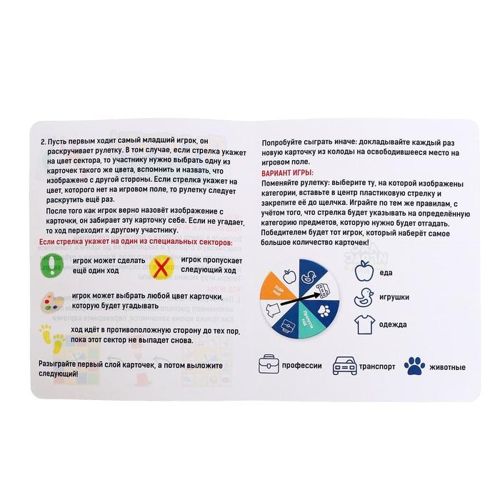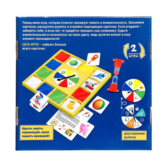 Настольная игра отлично тренирует память и внимательность. Попросите ребёнка запомнить картинки и раскрутить рулетку. А теперь пусть он откроет подходящую карточку. Если угадаете картинку — забираете себе, нет — передаёте ход сопернику. И пусть удача будет на вашей стороне!
