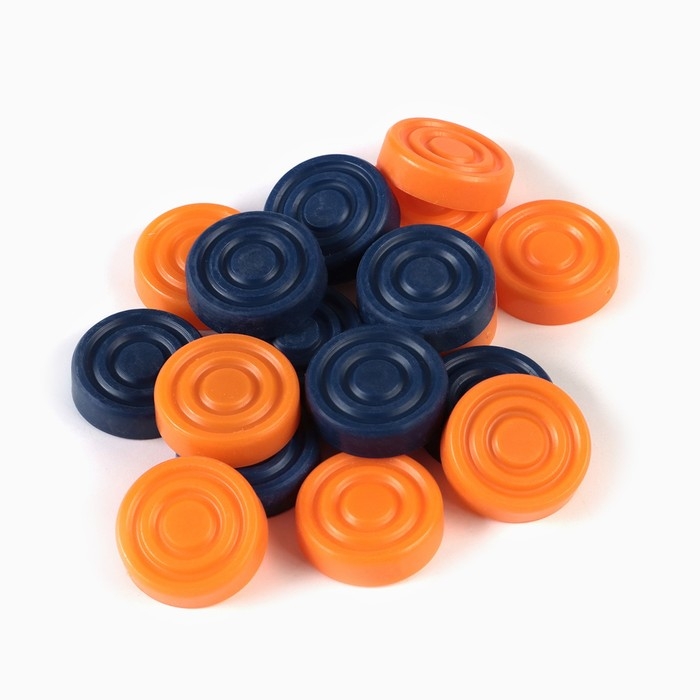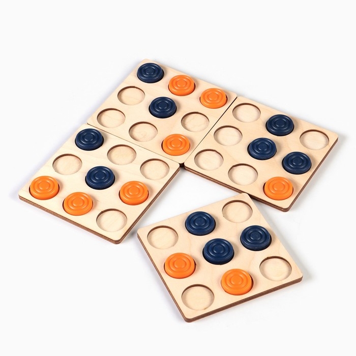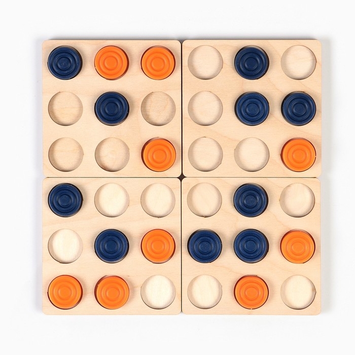 Состав игры: 18 оранжевых и 18 синих шашек размером 2.2 х 0.7 см, 4 деревянных поля размером 12 х 12 см