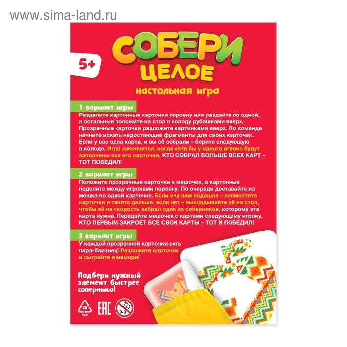 Разделите картонные карточки поровну между игроками, а прозрачные разложите на середину игрового поля. По команде все участники начинают искать недостающие фрагменты своих картонных карточек среди прозрачных, чтобы при наложении одну на другую у вас получилась цельная картинка. Будьте внимательны: форма осколочка может совпасть, а орнамент может оказаться неподходящим и наоборот! Кто справится быстрее – тот и победил!