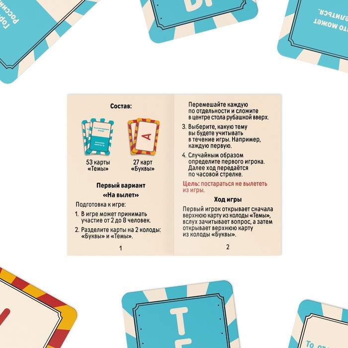 Вытягивайте карту из колоды «Темы», зачитывайте вопрос и засекайте 30 секунд. После первый игрок открывает верхнюю карту из колоды «Буквы». Его задача: дать ответ сначала на одну карту с темой, затем на другую и так далее. Как только время проходит, игрок останавливается. Пить нужно за каждую отложенную карту или выкрикнутый ответ.