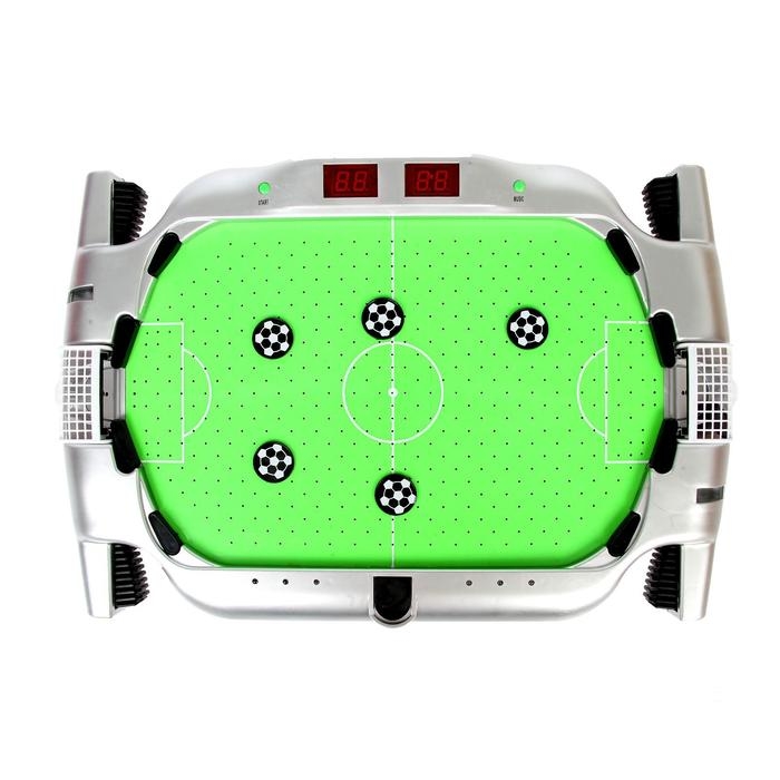 2 участника соревнуются друг с другом, задача каждого — забивать голы в ворота соперника с помощью кнопок и рычажков.