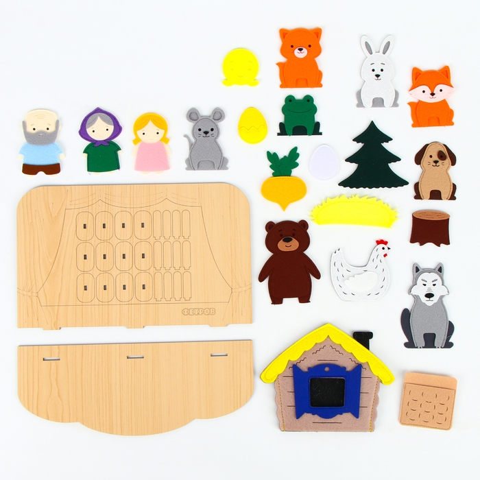 - Каждого персонажа можно установить на деревянные подставки и расставить на сцене, надеть на пальчики ребёнка и устроить театральную импровизацию или сюжетную игру вместе с домиком-декорацией.
