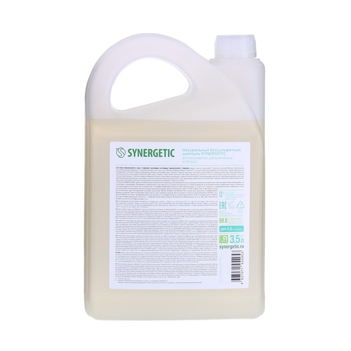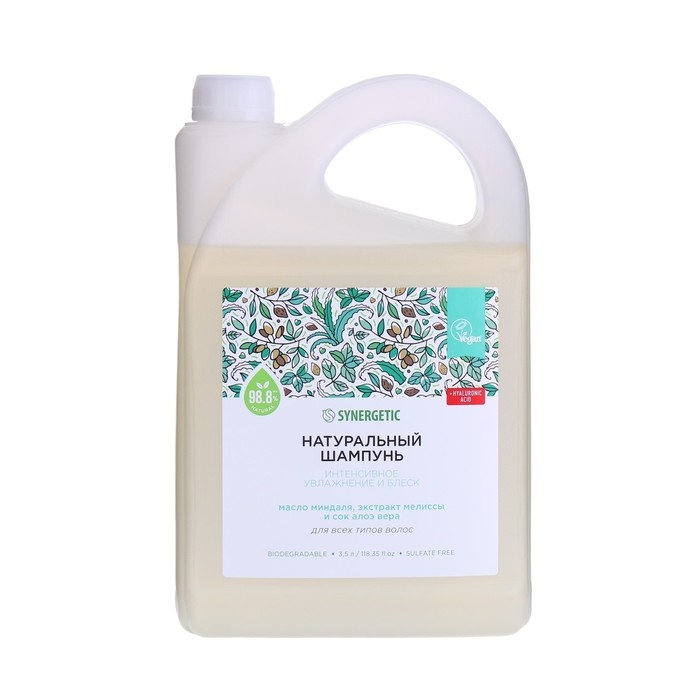 Натуральный бессульфатный шампунь SYNERGETIC Интенсивное увлажнение и блеск, 3,5 л