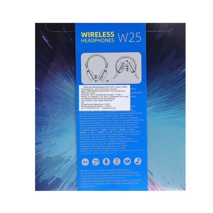 Наушники Hoco W25, беспроводные, накладные, BT5.0, 300 мАч, микрофон, синие