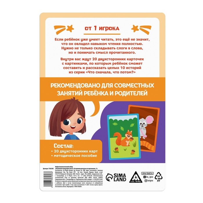 Если ребёнок умеет читать слова и предложения, это ещё не значит, что он овладел навыком чтения. Ведь нужно не только складывать слоги в слова, но и понимать смысл прочитанного. В наборе ребёнка ждёт 20 двухсторонних карточек с картинками, по которым он сможет составить и рассказать целых 10 историй из серии «Что сначала, что потом?».