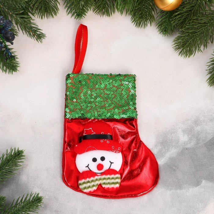 Носок для подарков "Снеговик блеск, снежинка" 13х16 см, красно-зелёный