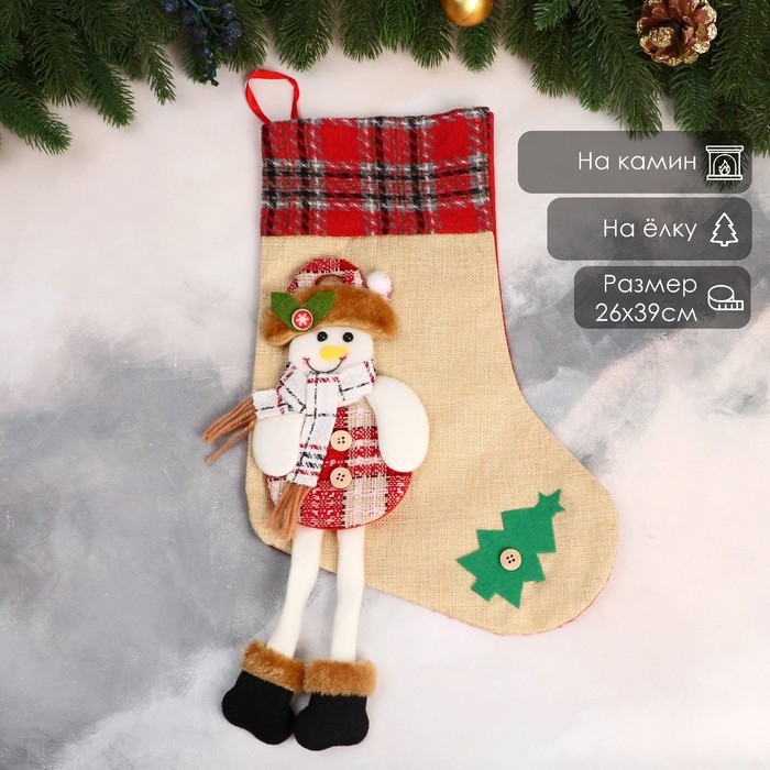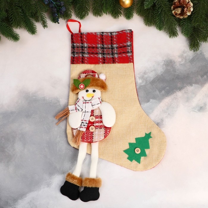 Носок для подарков "Снеговик с длинными ножками, ёлочка" 26х39 см, бежевый