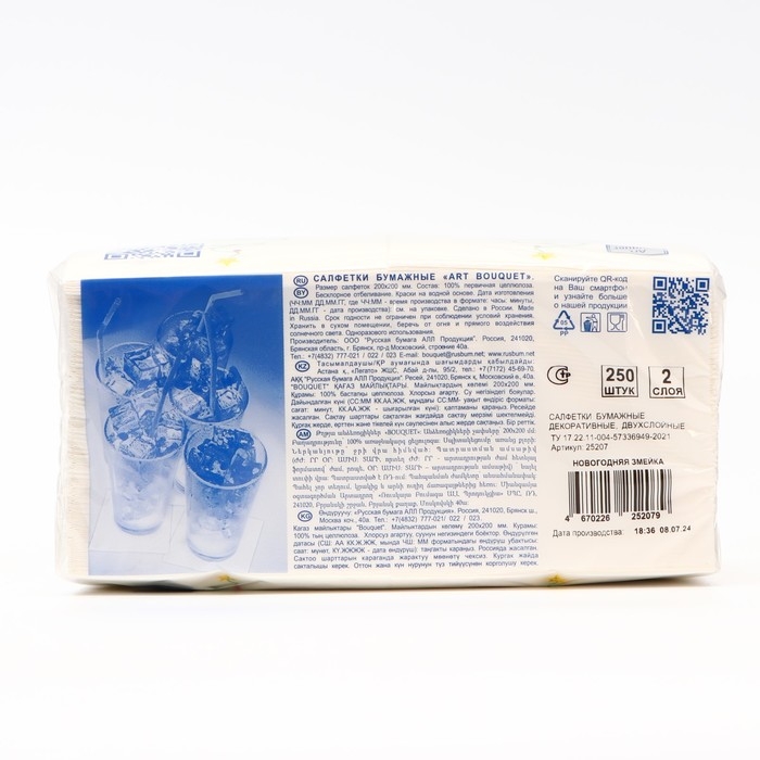 Салфетки бумажные Art Bouquet «Новогодняя змейка» — это идеальное сочетание стиля и качества. Двухслойные салфетки размером 20х20 см станут прекрасным дополнением к вашему новогоднему столу или украшению интерьера.