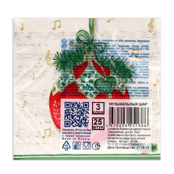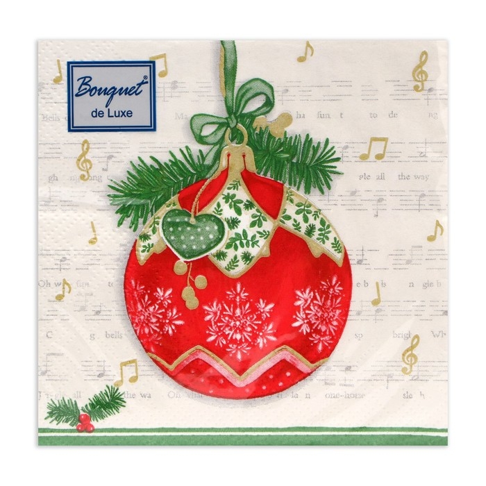 Новогодние салфетки бумажные Bouquet de Luxe «Музыкальный шар», 3 слоя, 24х24 см, 25 шт.