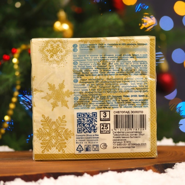 Новогодние салфетки бумажные Bouquet de Luxe «Снегопад Золото», 3 слоя, 24х24, 25 шт.